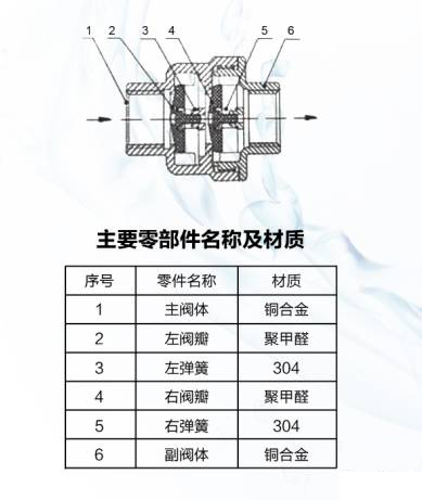 防水表空轉倒流防止器由兩級止回閥組成,通過(guò)螺紋連接組合成一體,是一種嚴格限定管道中的介質(zhì)只能單向流動(dòng)的水力控制組合裝置,防止管道介質(zhì)倒流,以達到避免水表空轉倒轉的目的,同時(shí)防止介質(zhì)倒流污染上游管網(wǎng)。正常供水時(shí),介質(zhì)推動(dòng)左右閥瓣開(kāi)啟,介質(zhì)順利通過(guò);停止供水時(shí),左右閥瓣在各自的彈簧推力作用下緊貼向閥體密封面。杜絕介質(zhì)回流到上游管網(wǎng)。當上游供水壓力穩定后避免水表的倒轉空轉的現象產(chǎn)生。當用戶(hù)小流量用水時(shí)(流量小于0.3L/h)利用閥腔內部壓差空間的變化,積分式開(kāi)啟倒流防止器,使水表間歇式轉動(dòng),從而達到精確計量用水,有助于用水公正管理。
